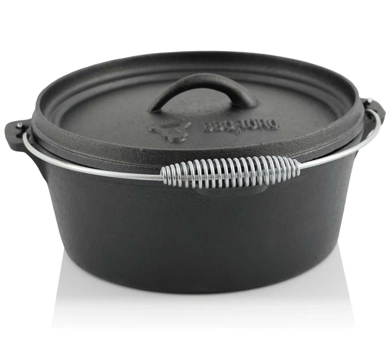 Der Dutch Oven ist ein schwerer, traditioneller, gusseiserner Topf und ein exakt passender Deckel mit dem man überall kochen, braten, schmoren, frittieren, dünsten und backen kann. Der Dutch Oven reguliert dank seiner hohen Masse (Gusseisen) ungleichmäßige Hitze und ermöglicht so ein gleichmäßiges Garen. Einfach glühende Kohlen, Glut oder Grillbriketts auf den Deckel und unter den Topf geben und das Dutch Oven-Erlebnis kann losgehen.
