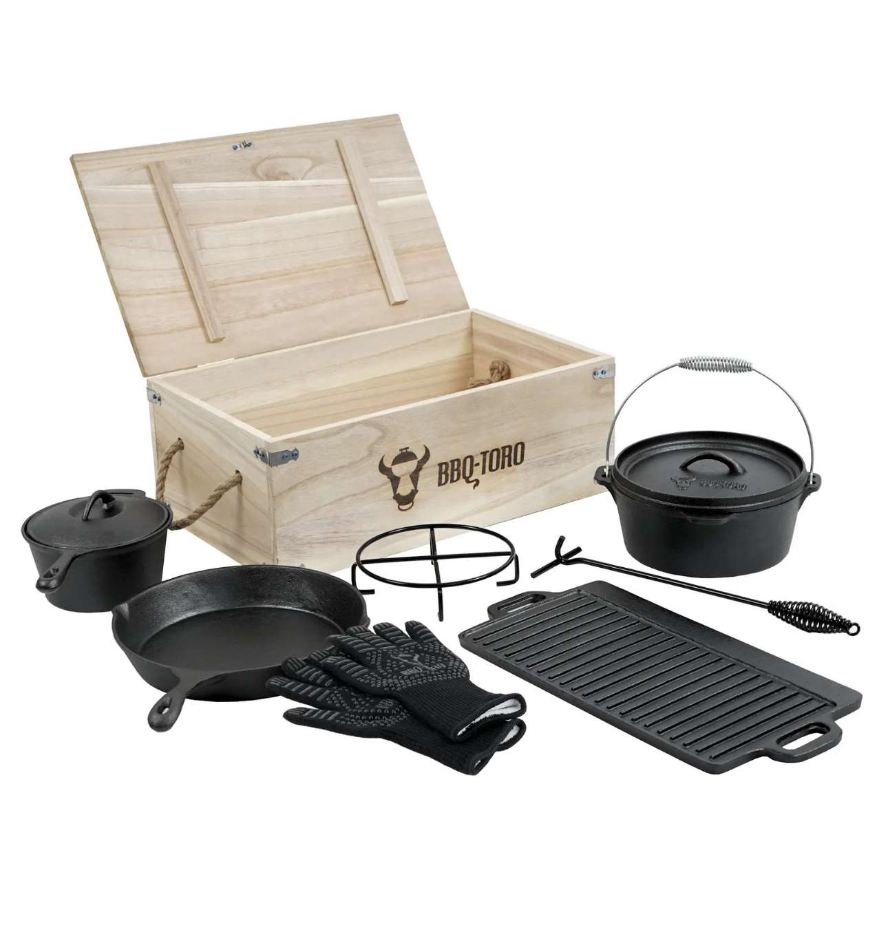 BBQ-Toro 8-teiliges Dutch Oven Set mit Holzkiste und viel Zubehör