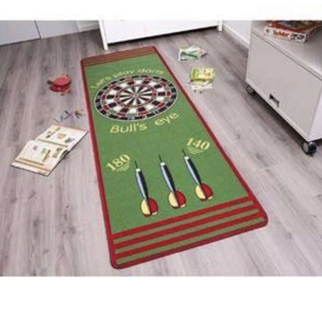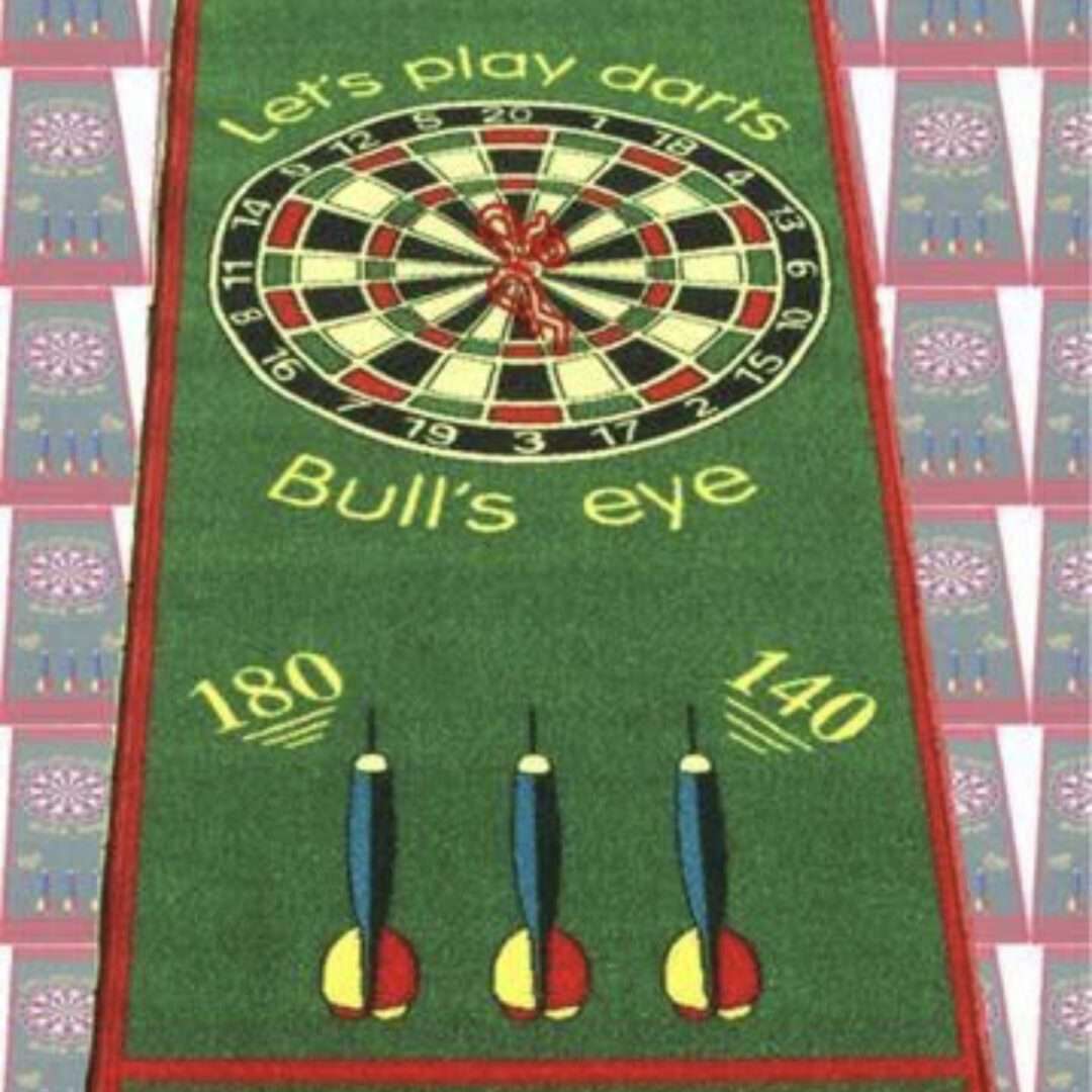 Strapazierfähiger Qualitätsteppich mit offiziellem Spielabstand. Der Vorleger dient als Wurflinie und als warme Unterlage auf dem Fußboden.