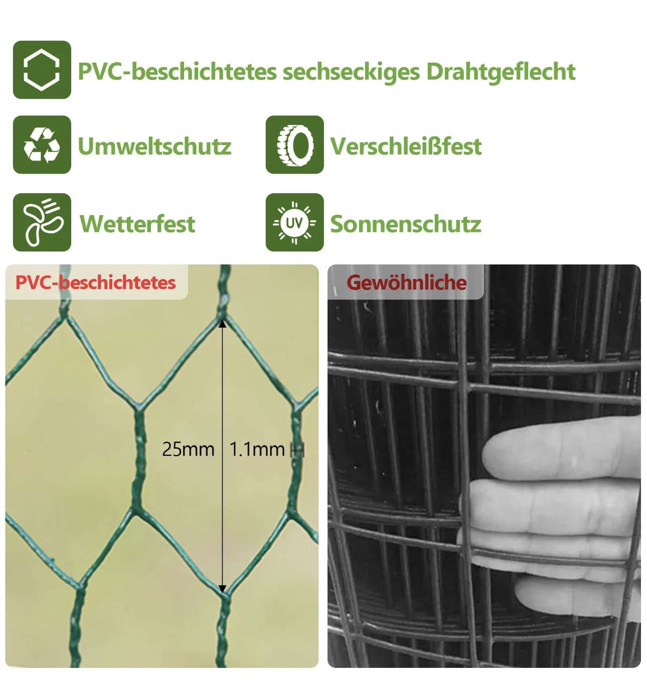 PVC-beschichtetes sechseckiges Drahtgeflecht: Hühnerstall aus PVC beschichtetem sechseckigem Drahtgeflecht, stark und langlebig. Kleine Lücken zwischen den Gittern erhöhen die Sicherheit Ihrer Hühner und schützen sie vor einigen Raubtieren.