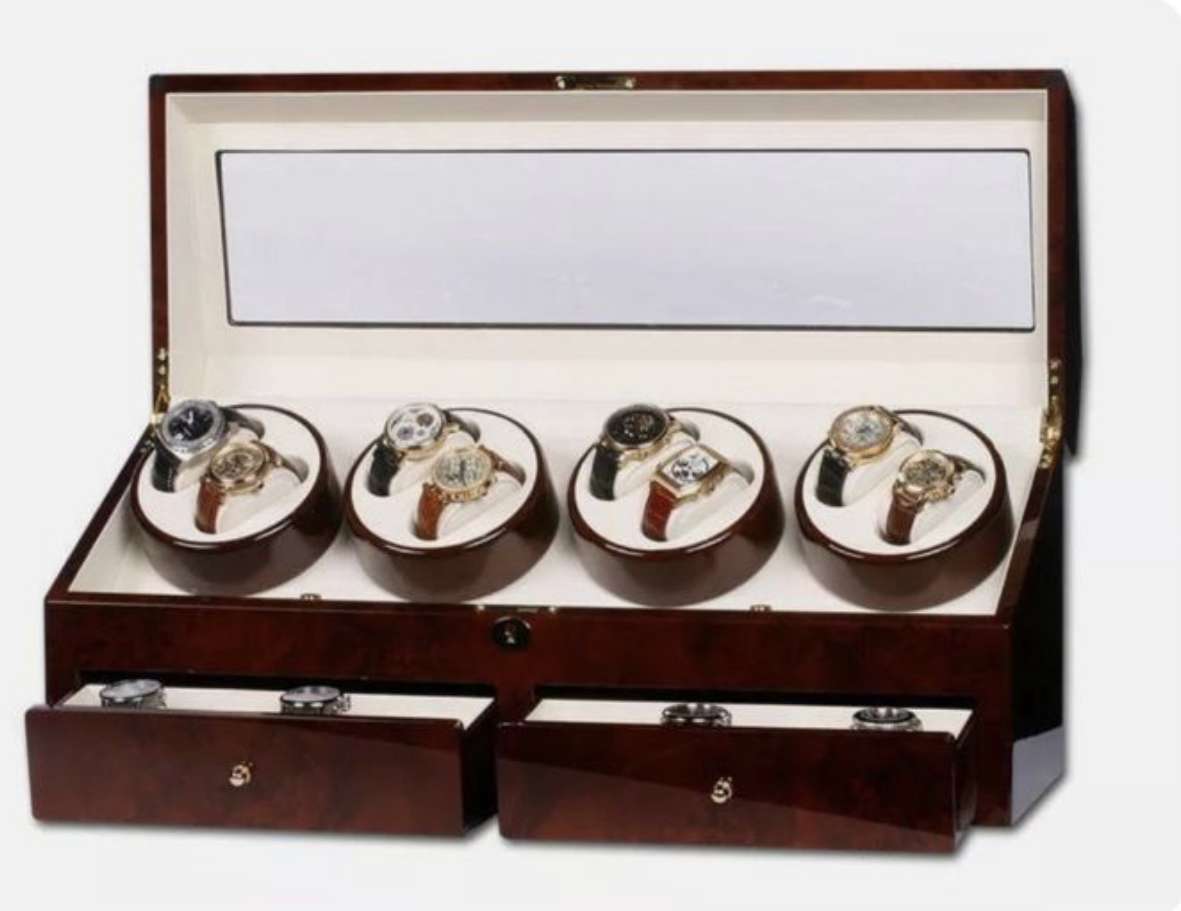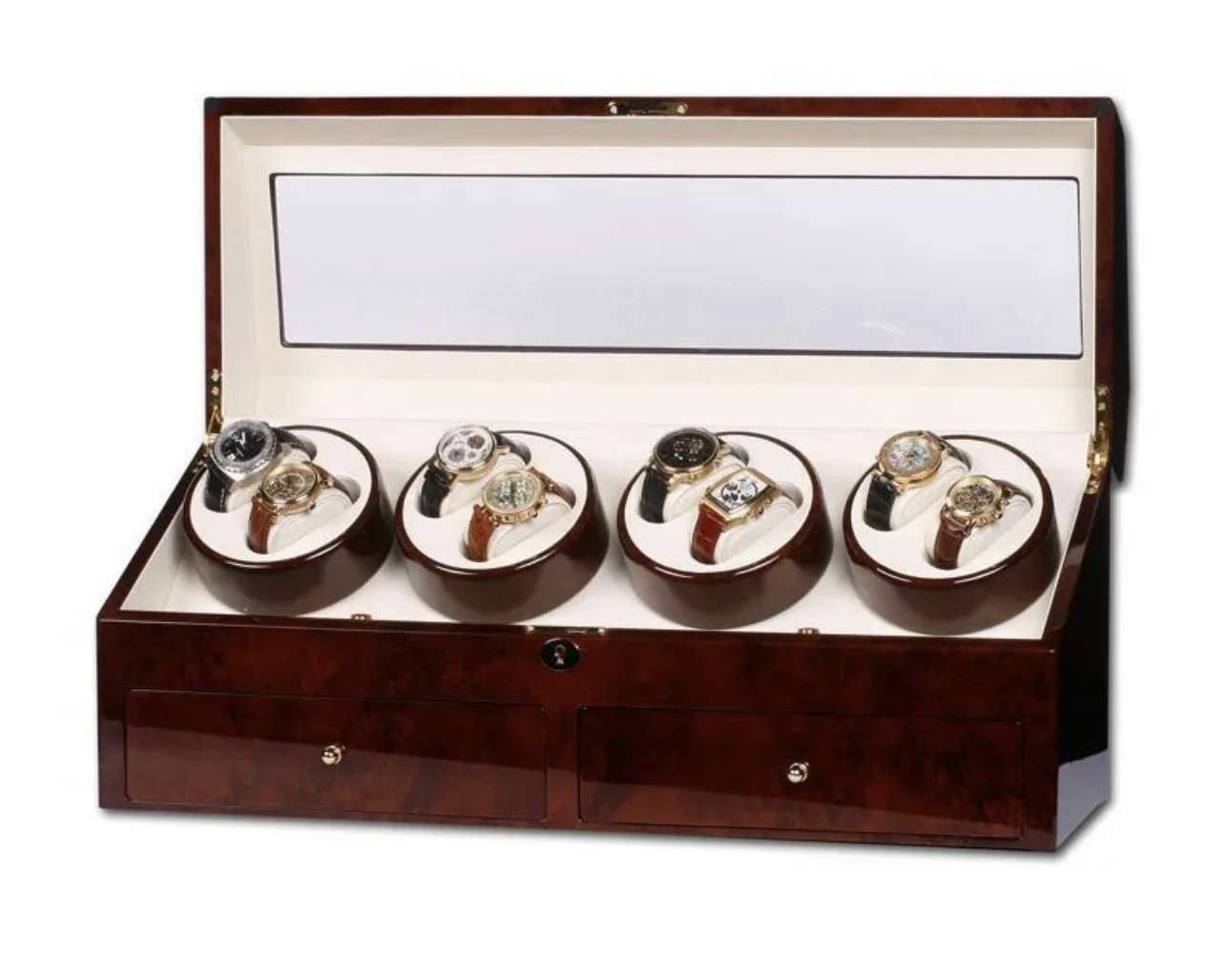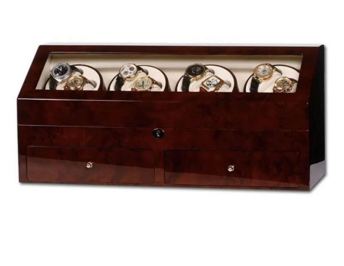 Professioneller Uhrenbeweger für 8 Automatikuhren in besonders luxuriösem Design, mit 2 extra Schubladen für weitere 8 Uhren. Handwerkliche Perfektion und ein hochglänzendes Walnussholzfurnier mit bis zu 20 handpolierten Lackschichten. Ein wirklicher Traum!