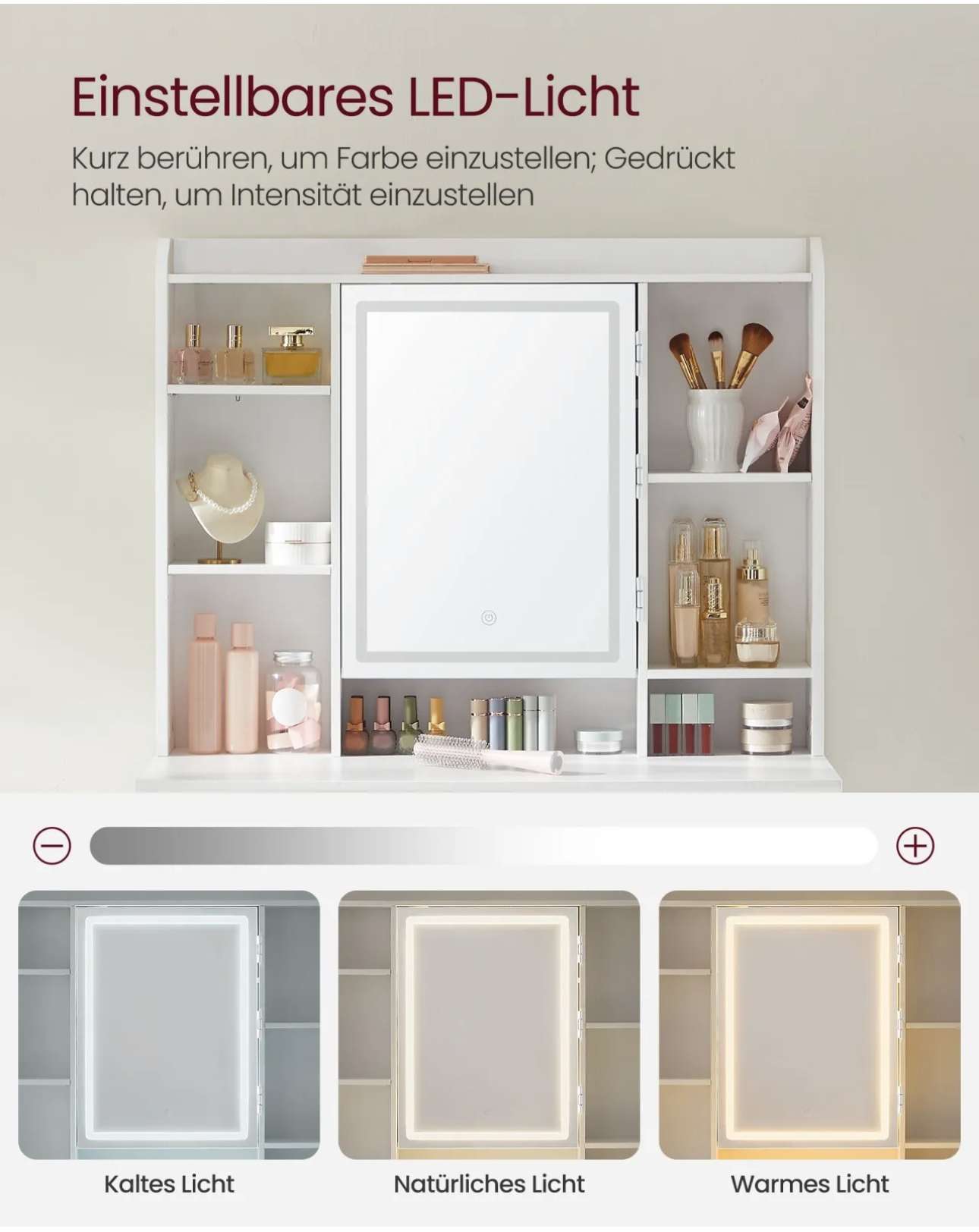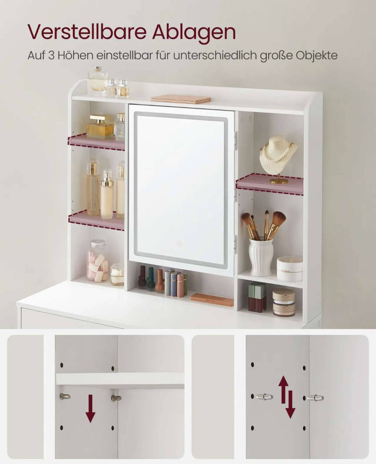 - [Verstellbare Fächer für verschiedene Produkte] Die 2 Ablagen auf der linken Seite und die mittlere Ablage auf der rechten Seite sind in 3 Höhen verstellbar, um Hautpflegeprodukte und Make-up in verschiedenen Größen unterzubringen