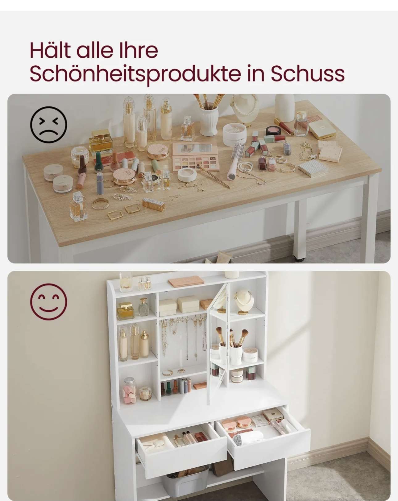- [Stabil und strapazierfähig] Dieser Kosmetiktisch aus hochwertigen Spanplatten ist stabil und langlebig; seine Beschichtung ist verschleißfest und leicht zu reinigen, so dass er lange Zeit verwendet werden kann