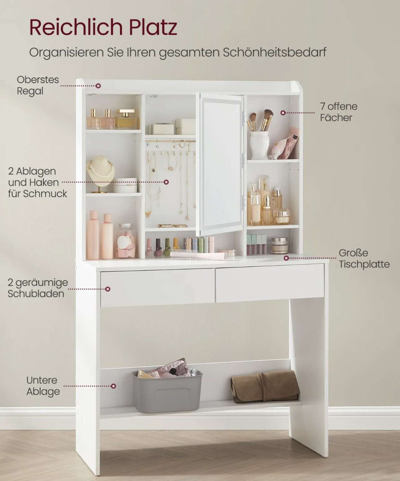 - [Geräumig] Dieser Schminktisch bietet oben 1 Ablage für Parfüm, 7 offene Fächer für Make-up, 2 Ablagen und Haken für Schmuck hinter dem Spiegel, 1 große Ablage, 2 Schubladen und 1 Ablage im unteren Bereich. Hier findet alles seinen Platz
